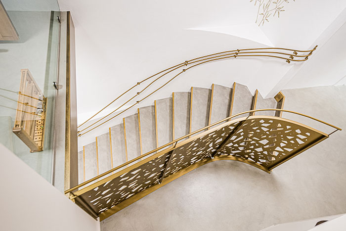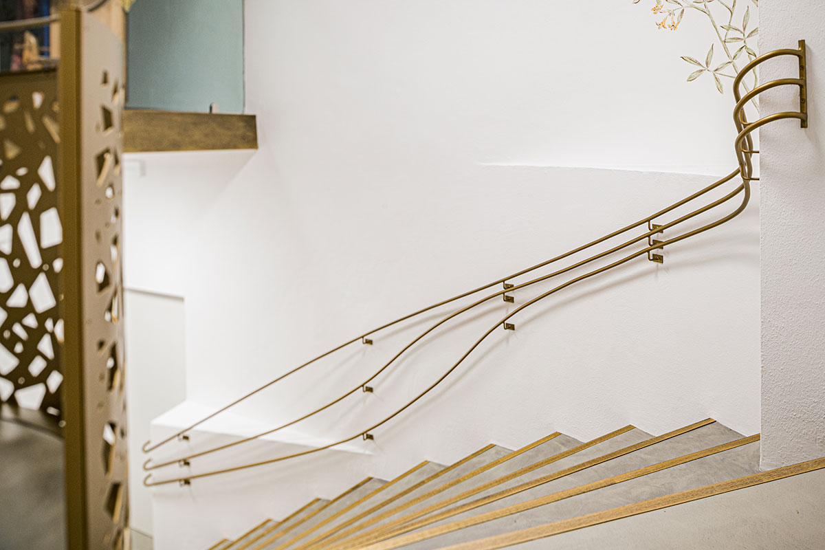 In Zusammenarbeit mit der Firma Haidacher KG haben wir die Schlosserarbeiten im Rahmen des Umbaus des renommierten Modegeschäfts Tschurtschenthaler in Bruneck übernommen. Sämtliche Regale und Kleiderstangen wurden aus Stahl gefertigt und in goldähnlicher Farbe lackiert. Die Treppen wurden mit brünierten Messingblechen verkleidet. Der Handlauf der gewendelten Treppe musste vor Ort mit Hand genau an die baulichen Gegebenheiten angepasst werden. Das kann man als echtes Handwerk bezeichnen da keine Maschine imstande war, so ein Geländer zu fertigen.